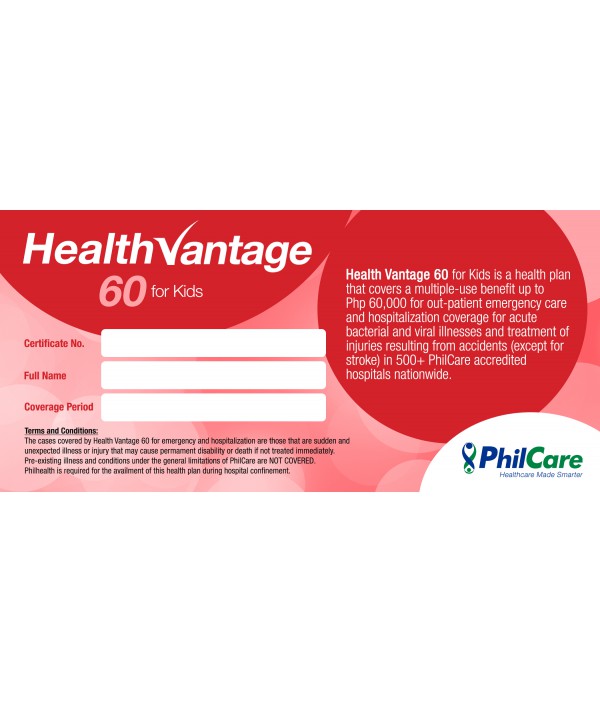 Health Vantage 60 for Kids is for ages 6 months to 17 years old and is valid for 1 year upon activation date. Benefits starts 7 days after activation date. The Certificate of Coverage is non-transferable once activated.